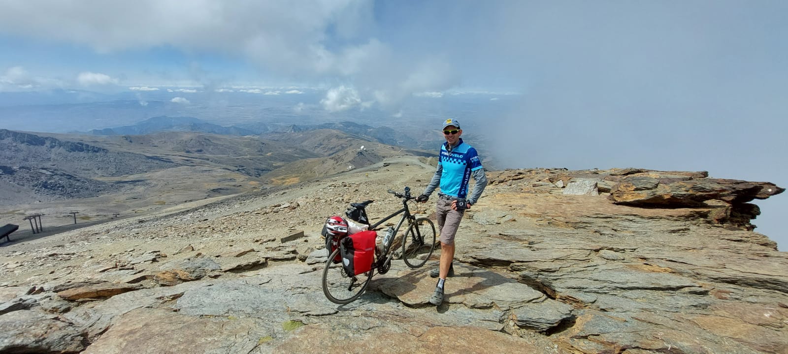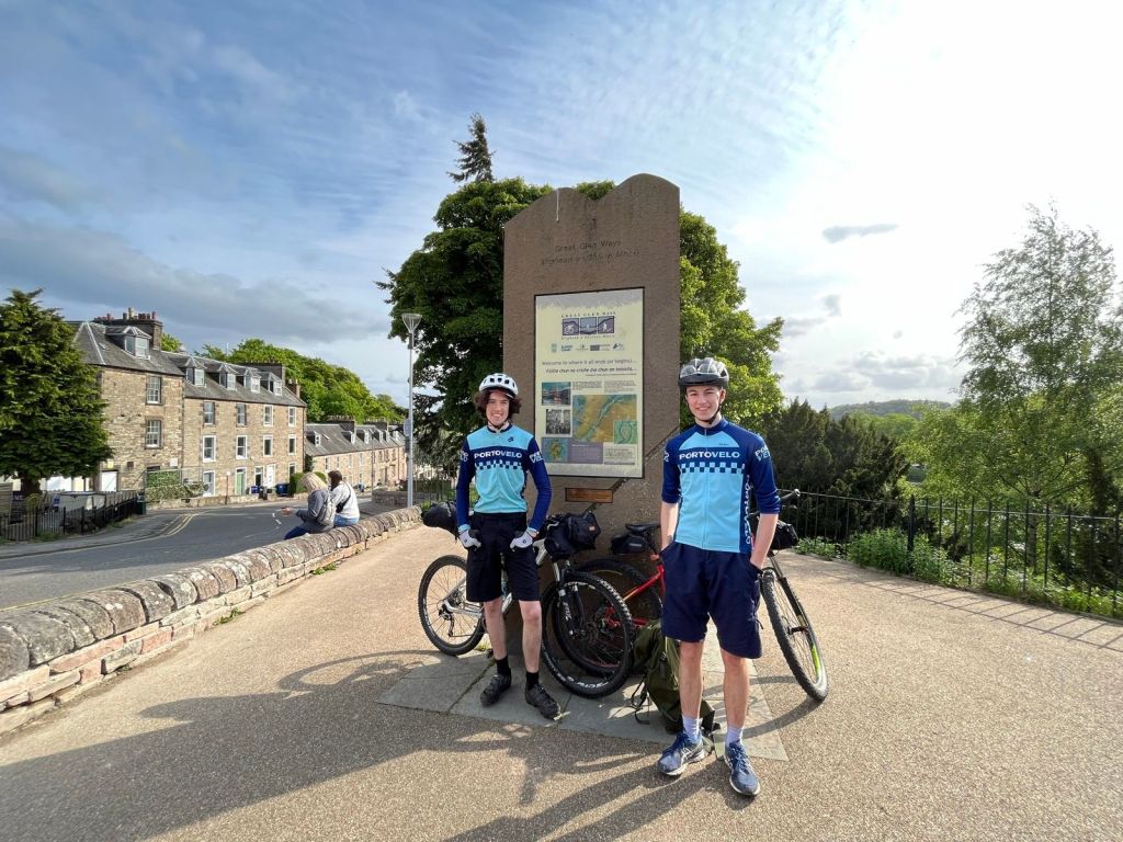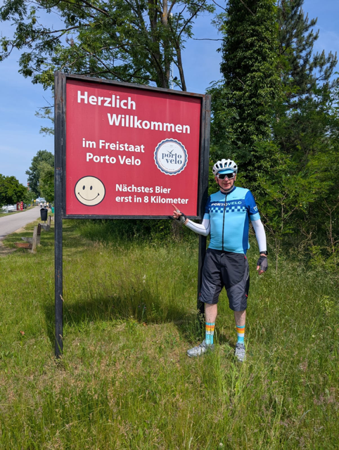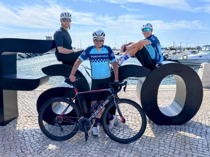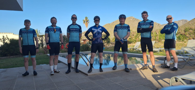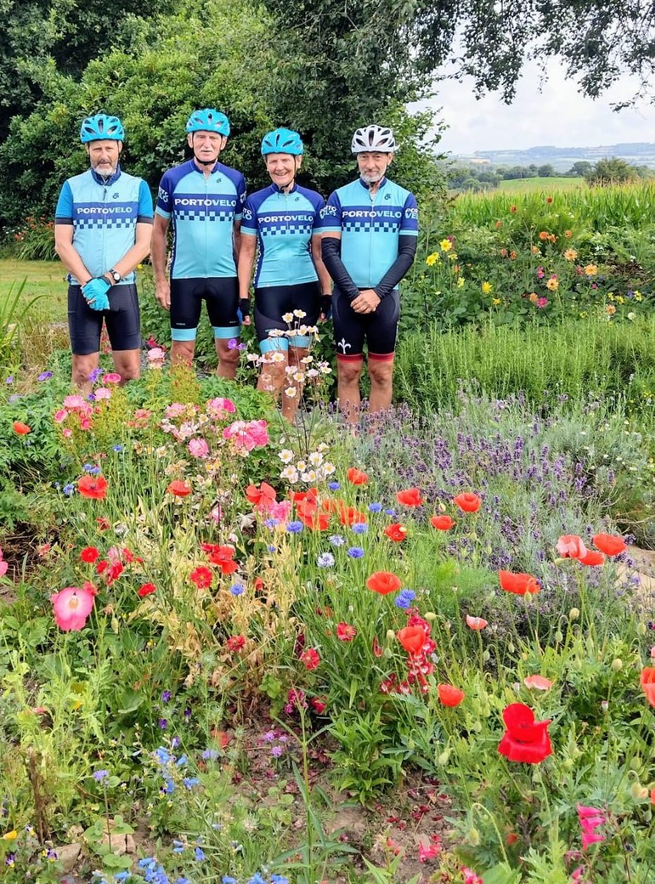 Andrew and Robert completing Land’s End to John O’Groats, July 2021Roy at the summit of Pico Valeta, Andalucia – Europe’s highest paved road – September 2021Tim and Carol in the Dolomites, June 2022Portovelo jersey line-up at Gordon’s place in Brittany, July 2022Portogravelo riders on the Badger Divide, early May 2023Portovelo jerseys in Fort Augustus (mountain biking the West Highland Way and Great Glen Way), May 2023Peter, Isaac and Will, having completed the N2 challenge from the north of Portugal to the south, in 5 days, September 2023Drew, Paul, Blair, Colleen, Graham, Roy and Bruce in Mallorca, April 2024Ian discovers a bar in Austria named after his favourite club.