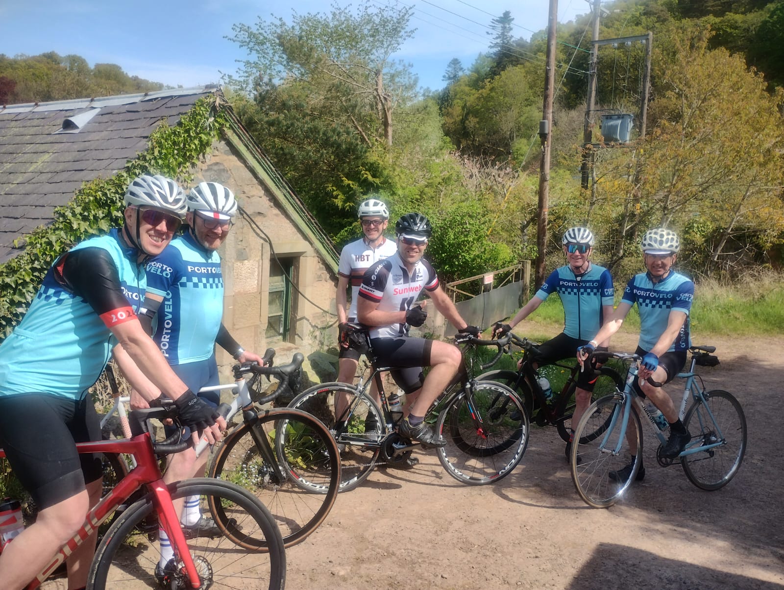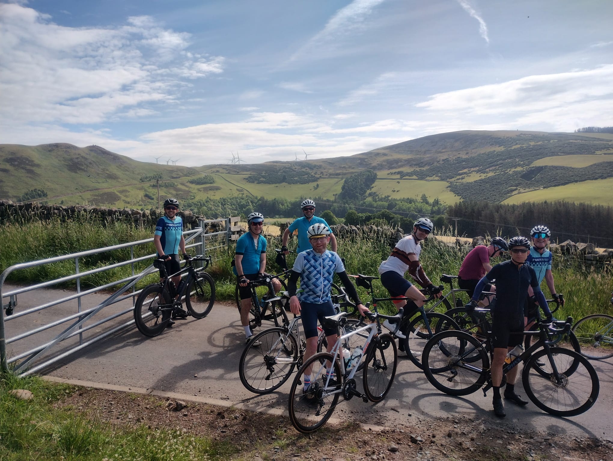 Sunday 11th – a beautiful day, and the intermediate group rode via Humble and Soutra to Heriot, back over the Granites (53 miles). The intermediate-plus ride was very similar, but the other way around, taking in Temple (57 miles). The fitness group rode out to Spott, up the Brunt and via Innerwick to Abbey St Bathans, back by the Rigg (77 miles). The fitness-plus ride was via the coach road and Elibank to Innerleithen, back over the Granites (71 miles).