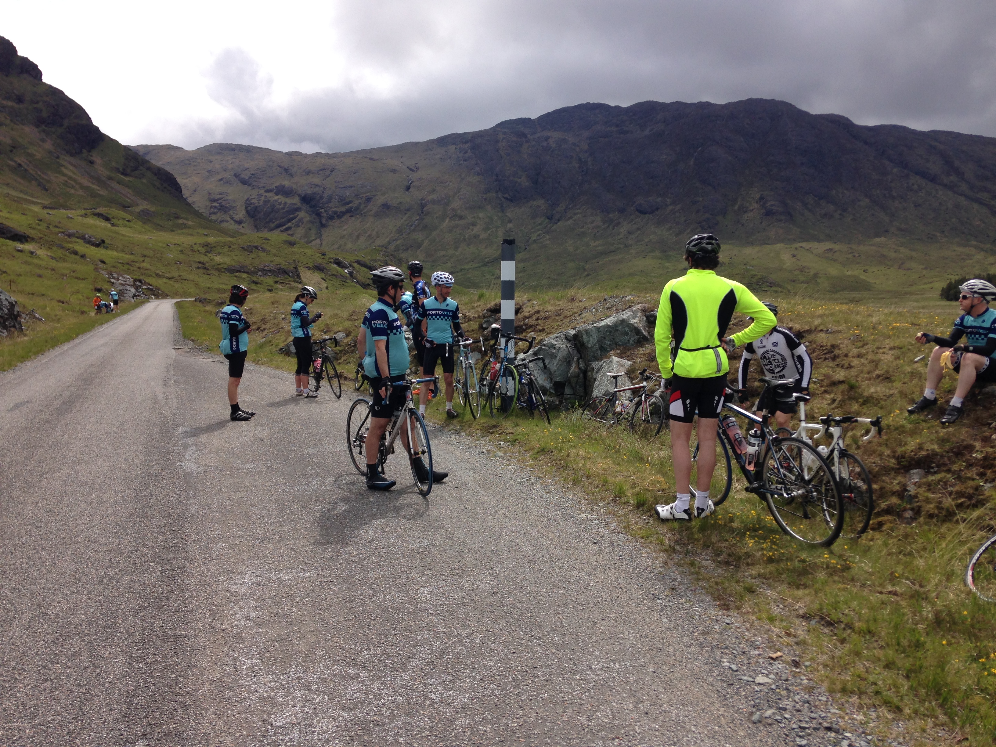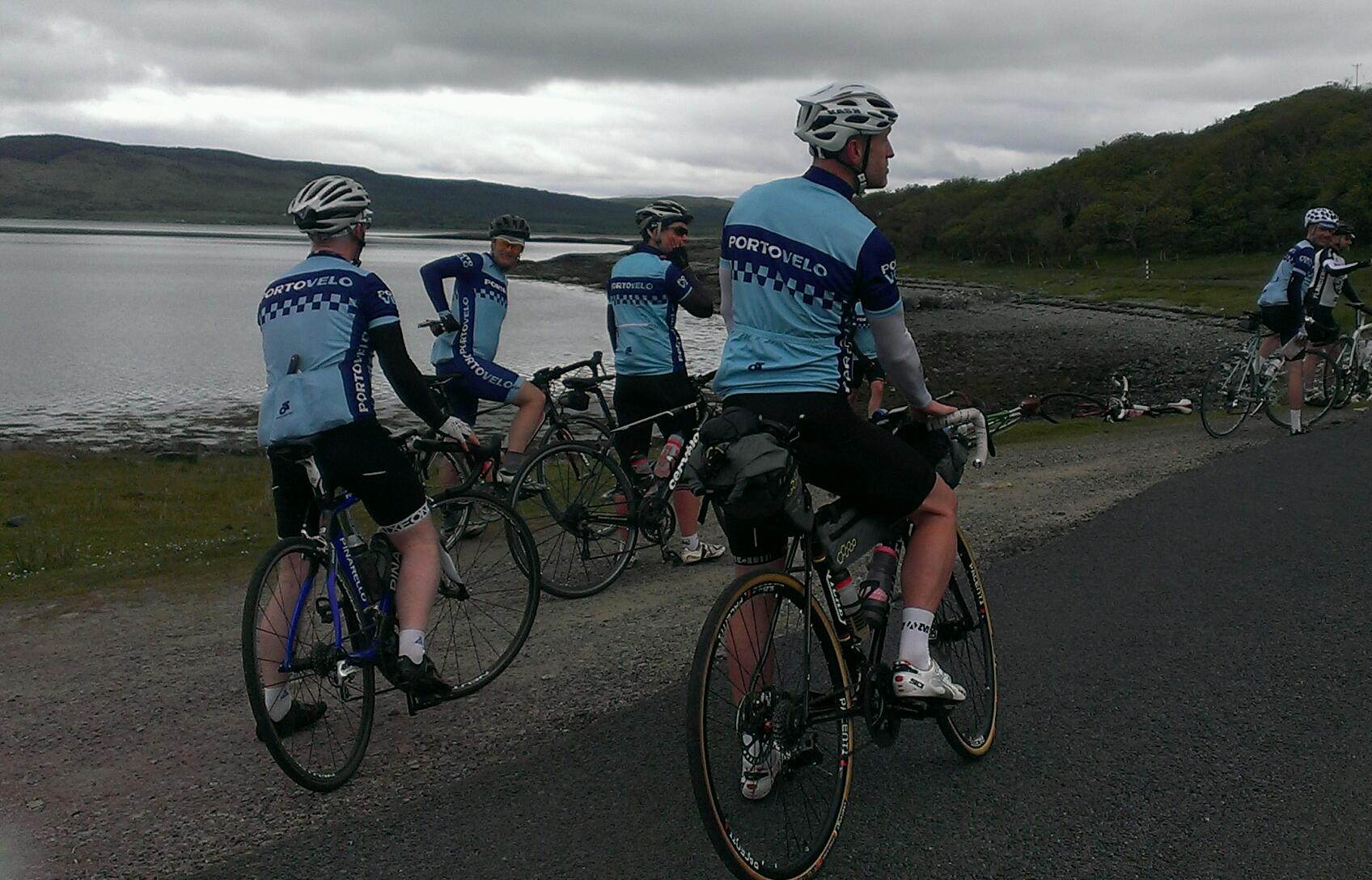 Friday 12th – Sunday 14th – for the 2015 Portovelo weekender, 14 riders travelled to Oban (one cycling the whole way, a few others stopping en route for a 60-odd mile warm-up ride). On Saturday, we took the ferry to Craignure on Mull, from where we did a 78 mile route around the island, taking in Glen More, the “scenic route” to Salen, the minor road to Dervaig via Glen Aros, a very hilly road over to Tobermory, then fast back down the main road to catch our ferry back to Oban – route here: http://www.mapmyride.com/routes/view/748510597. On the Sunday, fuelled by a slap-up meal the night before, we went south from Oban to Kilmelford, up a steep and gravelly road past Loch Avich and down to the west side of Loch Awe, north to Taynuilt, then back to Oban via Glen Lonan (52 miles) – route here: http://www.mapmyride.com/routes/view/748521123.